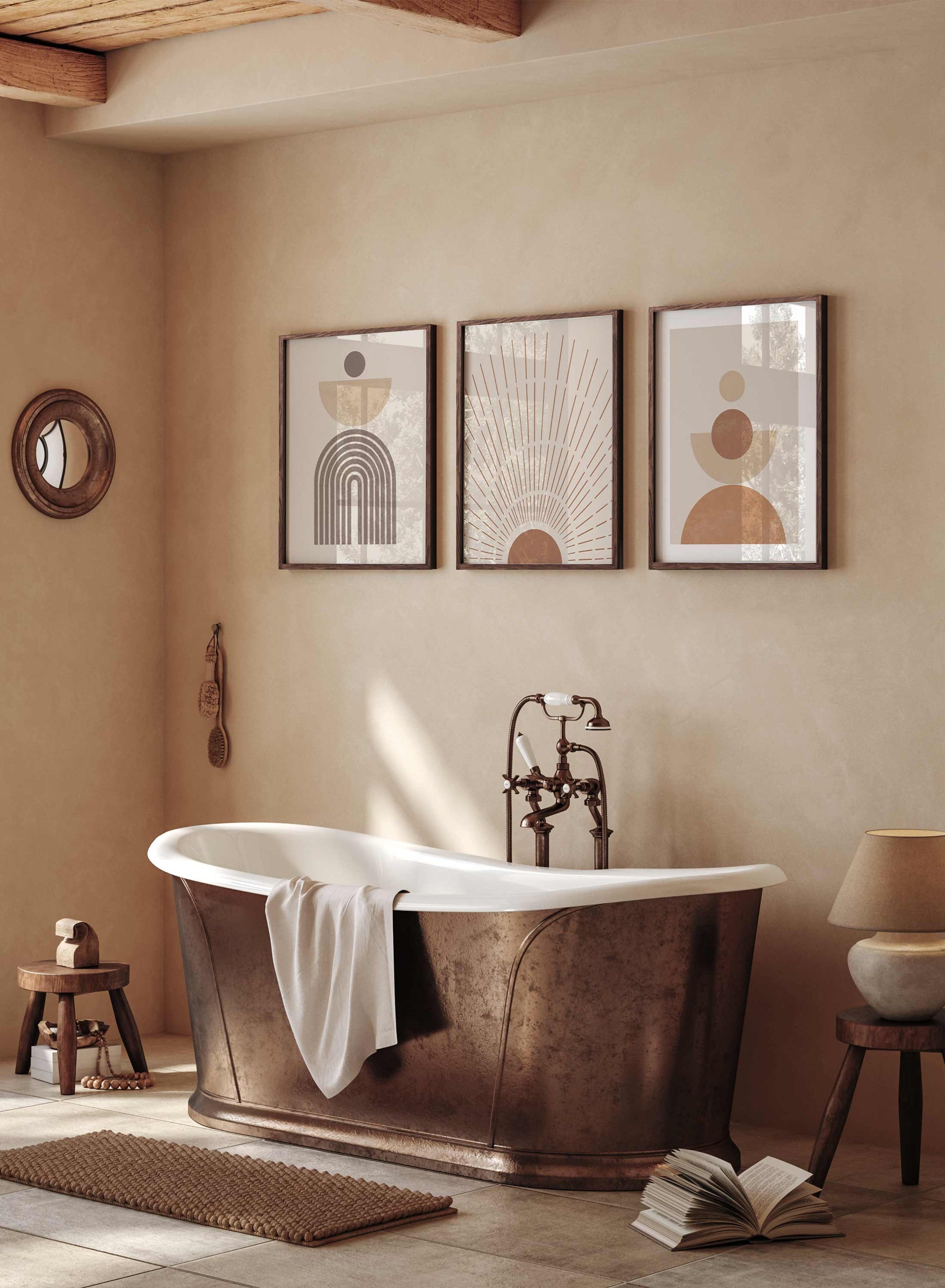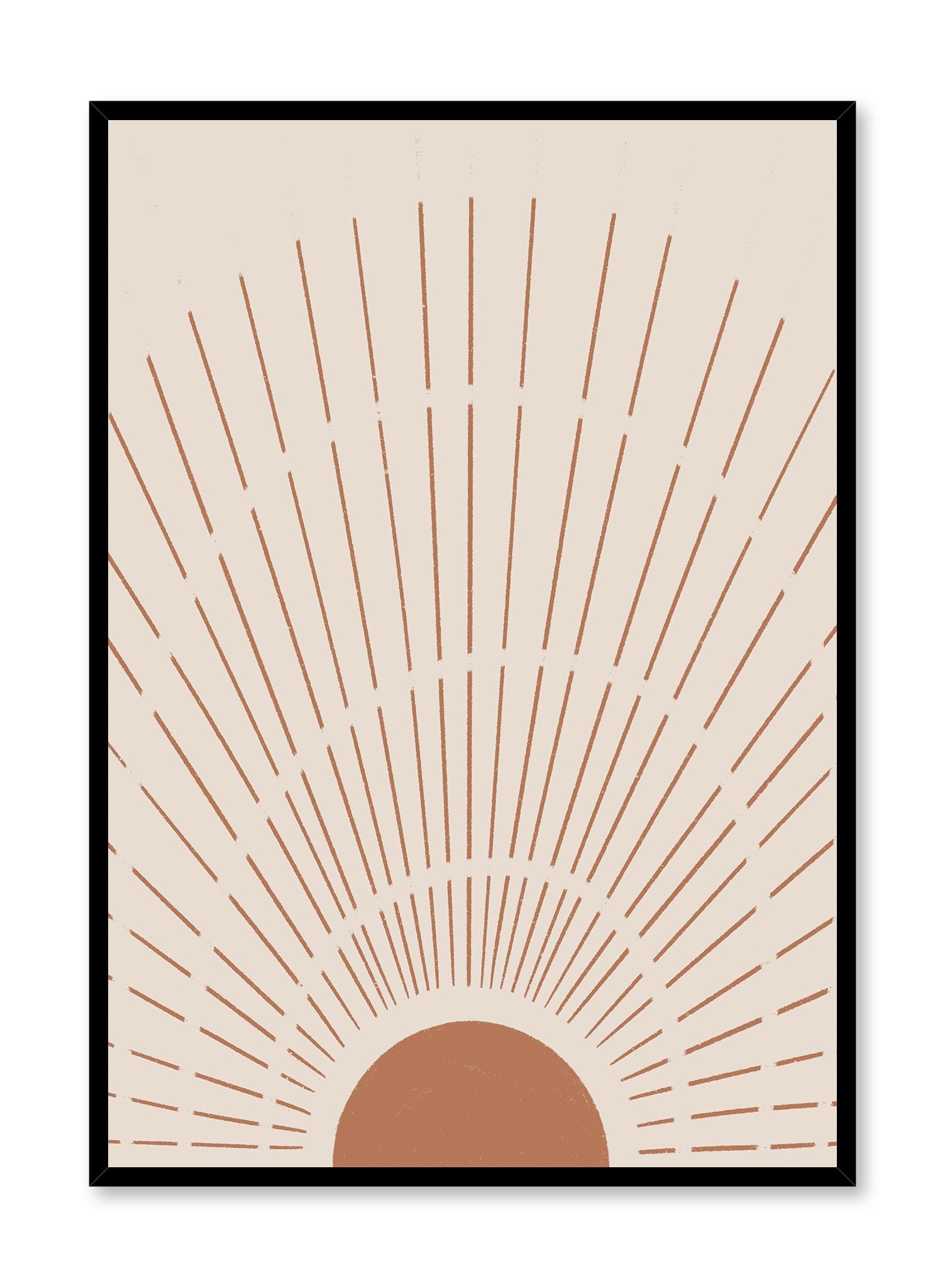 Here comes the sun! The ‘Beaming’ poster will add style and sunshine to your life with its boho design of an orange sun and abstract sun rays. The burnt-orange and beige color palette and vintage art-style of this print will fit beautifully with the rest of your bohemian-style art collection.