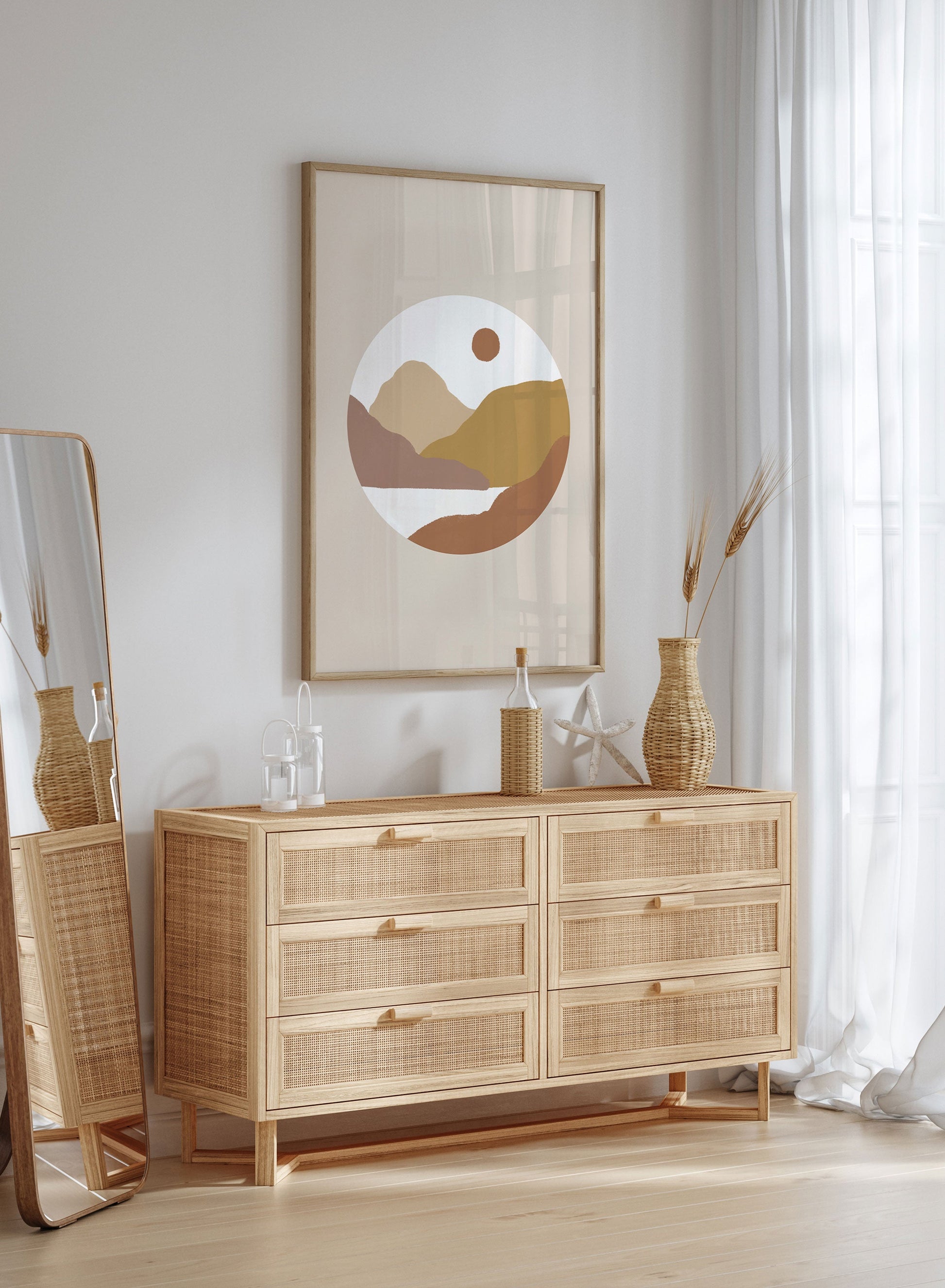 You’ll love the ‘Mojave’ poster which features an abstract and minimalist mountain landscape framed by a circle. A deep beige background highlights the orange and yellow in this print’s nature scenery.