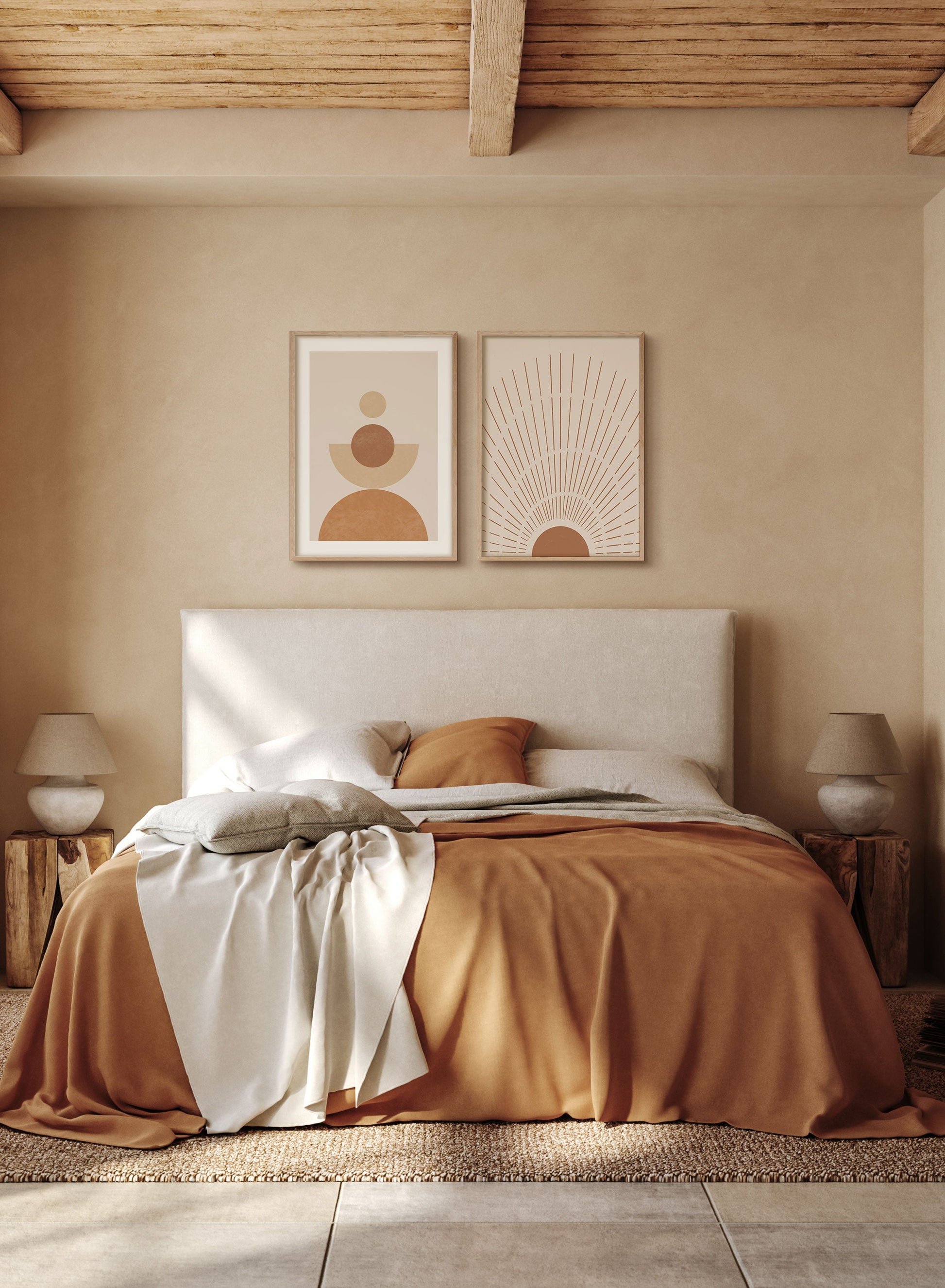 Are warm colors and boho art your thing? Then you’ll love the ‘Pendant’ poster with its bohemian design of textured orange, terracotta, and beige circles. Hang this geometric art print on a poster hanger for a casual chic look or add it to your gallery wall for a total ‘wow’ effect.